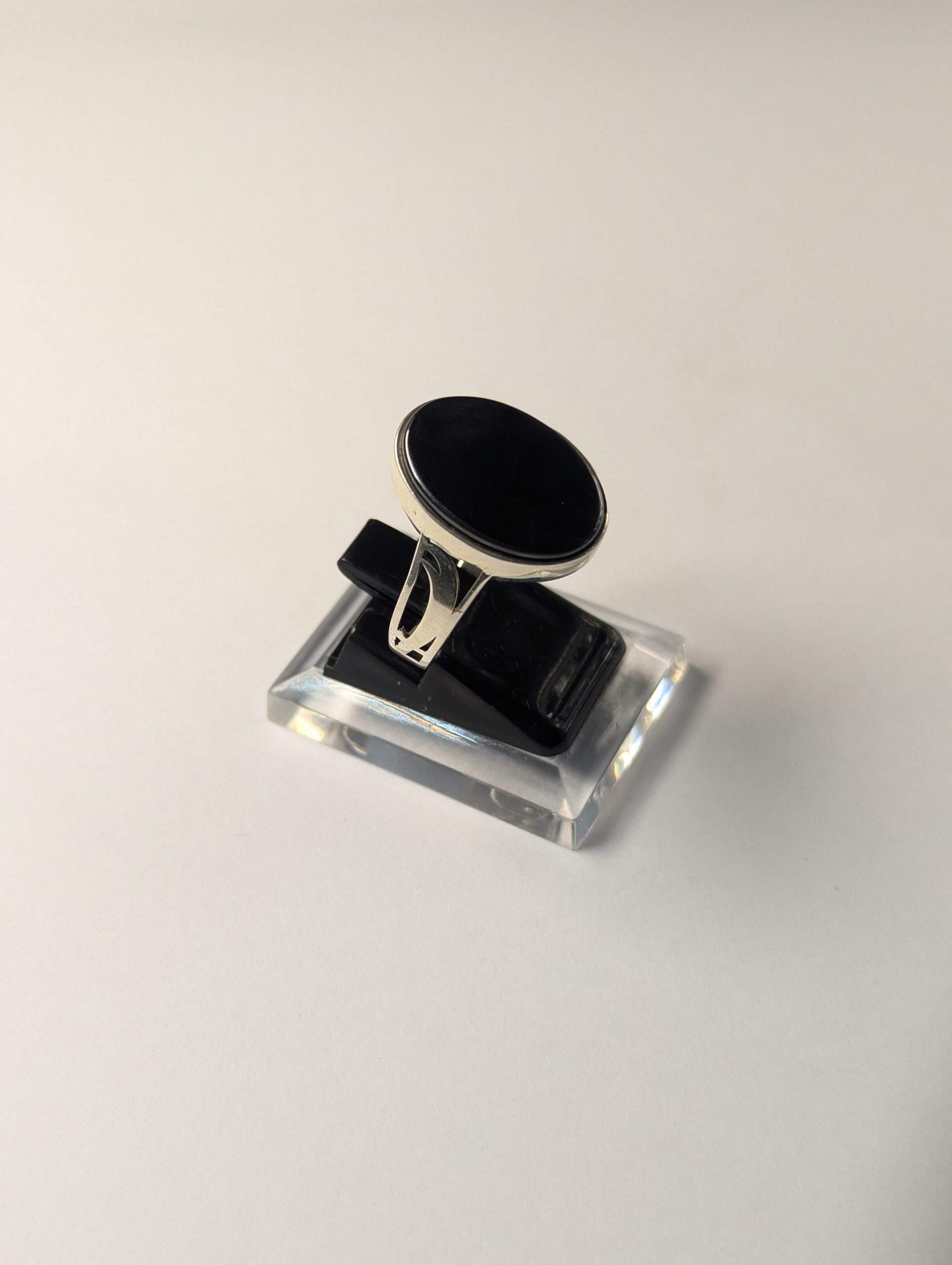 The stone is set in robust 925 Sterling Silver, chosen for its crisp polish and substantial weight. What makes this piece unforgettable is the band: it features bold, deep-set geometric patterns on the shoulders, creating a strong, architectural contrast against the smooth black stone. The combination of clean lines and textured detailing makes this ultimate accessory perfect for the man who appreciates sharp design and sophisticated simplicity.