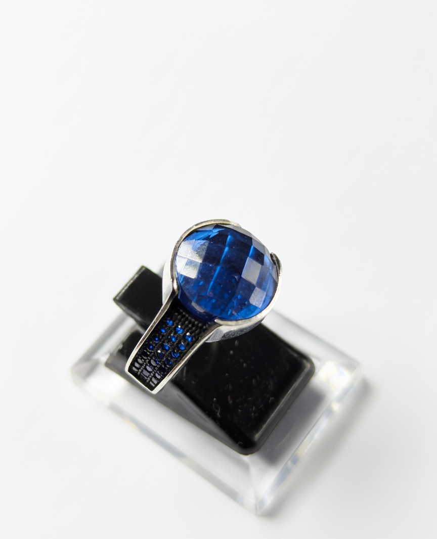 This commanding piece features a large, highly polished, Cabochon Blue Gemstone at its core, a color deep and powerful like a midnight sea. This central stone is securely cradled in authentic, enduring Sterling Silver. The band’s shoulders are detailed with a mesmerizing pave of dark, micro-set stones, creating an intense, masculine contrast that captures the light and the eye.