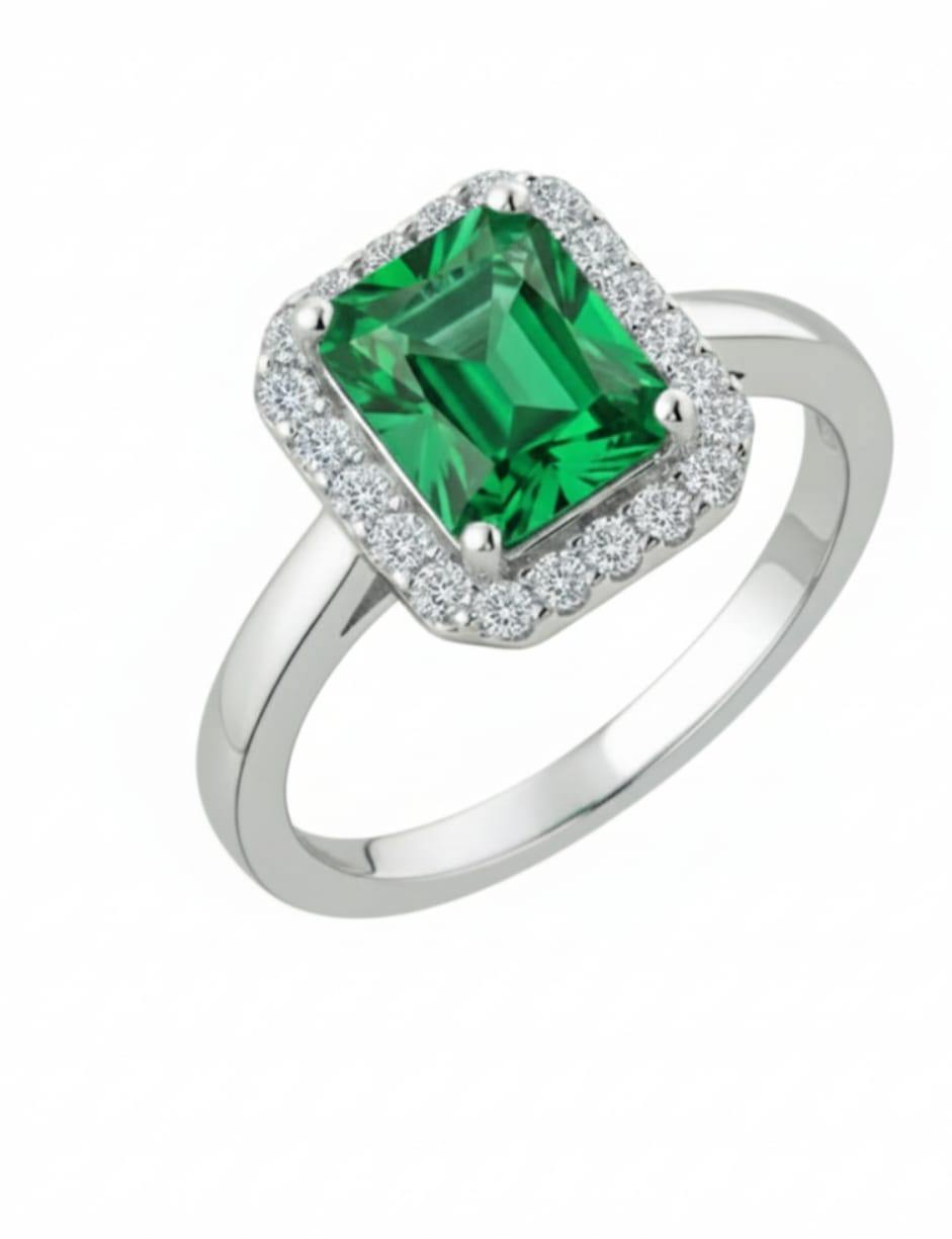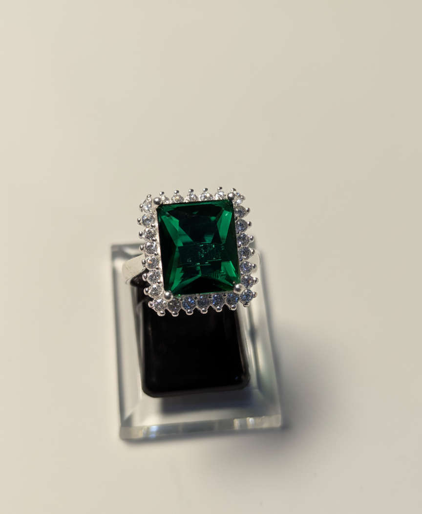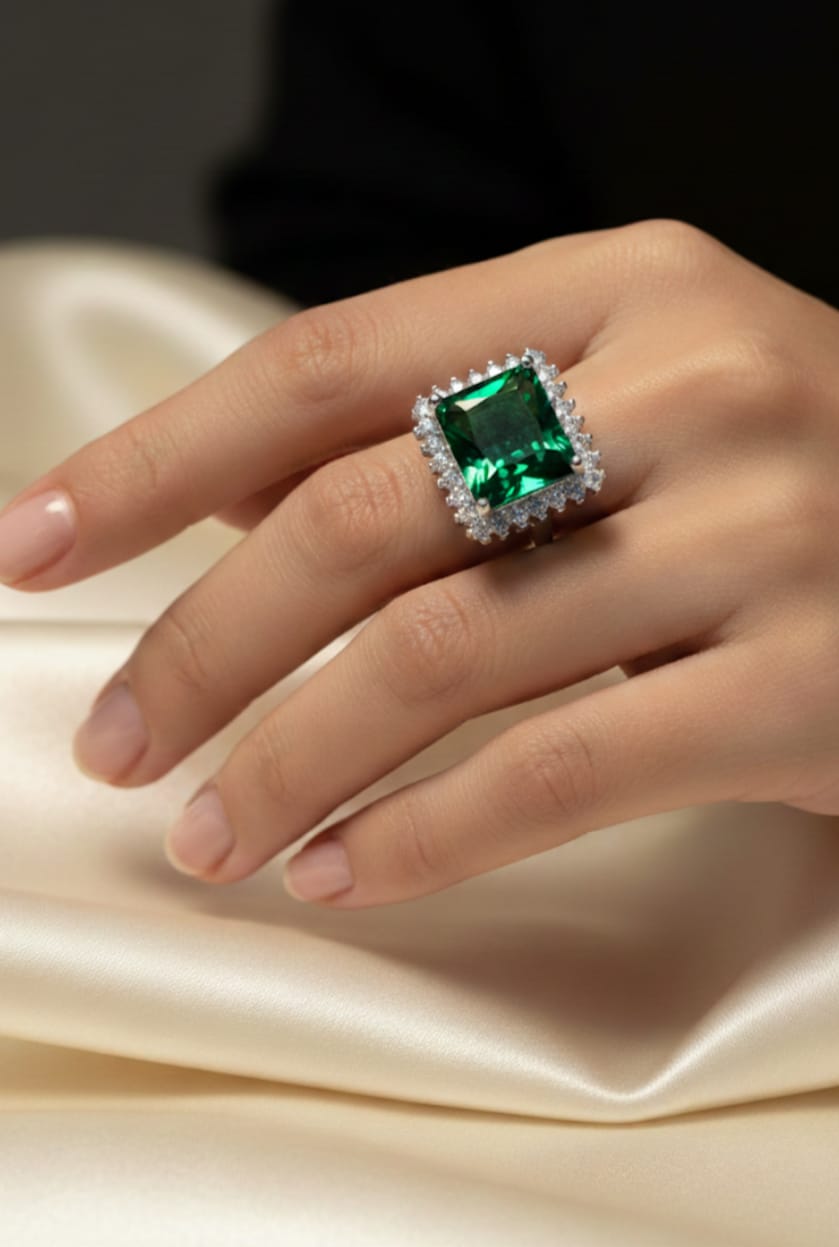 The centerpiece is a magnificent, deep-green Emerald-Cut Gemstone, symbolizing renewal and prosperity. This dramatic stone is expertly surrounded by a dazzling halo of brilliant-cut white accents, offering the opulent, radiant look of diamond jewelry without the premium price.