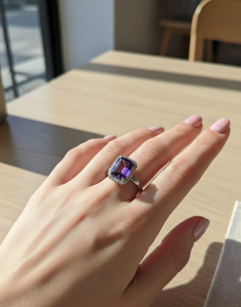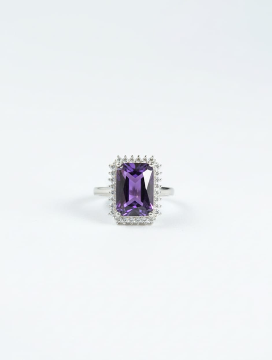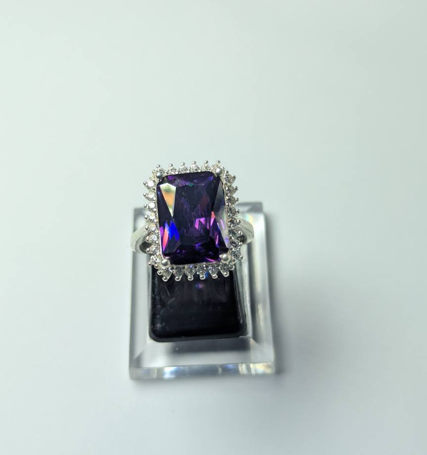 This exquisite Ladies Silver Ring is the definition of high-impact glamour. Designed to be a true centerpiece, it features a brilliantly oversized Emerald Cut Purple Stone that captivates with its vivid, color-shifting hues of deep violet and electric blue. If you are searching for a breathtaking Women’s Fashion Jewelry piece that demands attention, this Purple Stone Halo Ring is your perfect match.