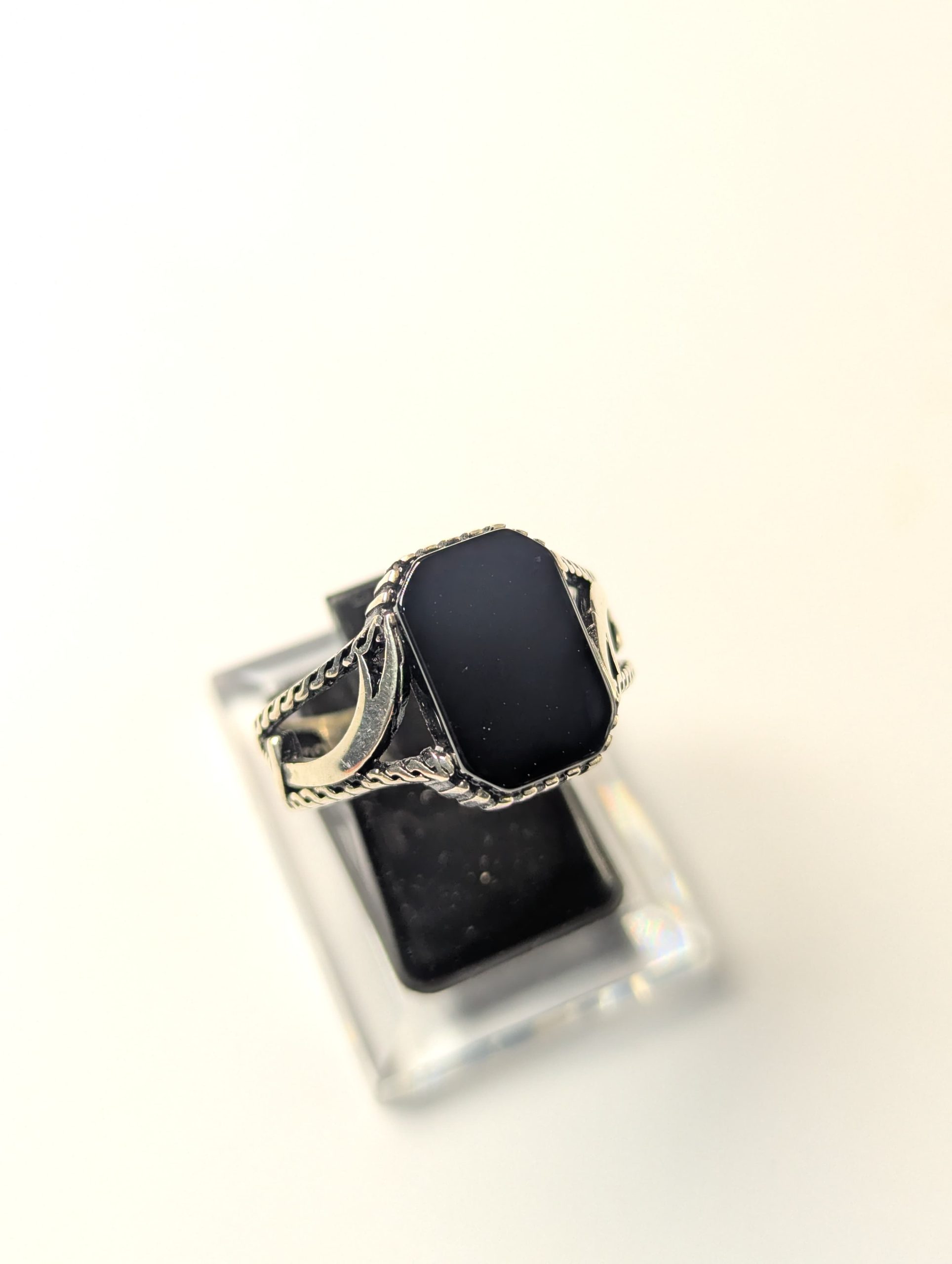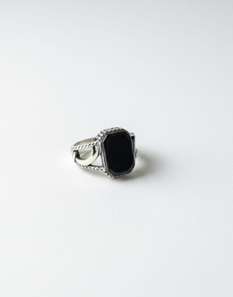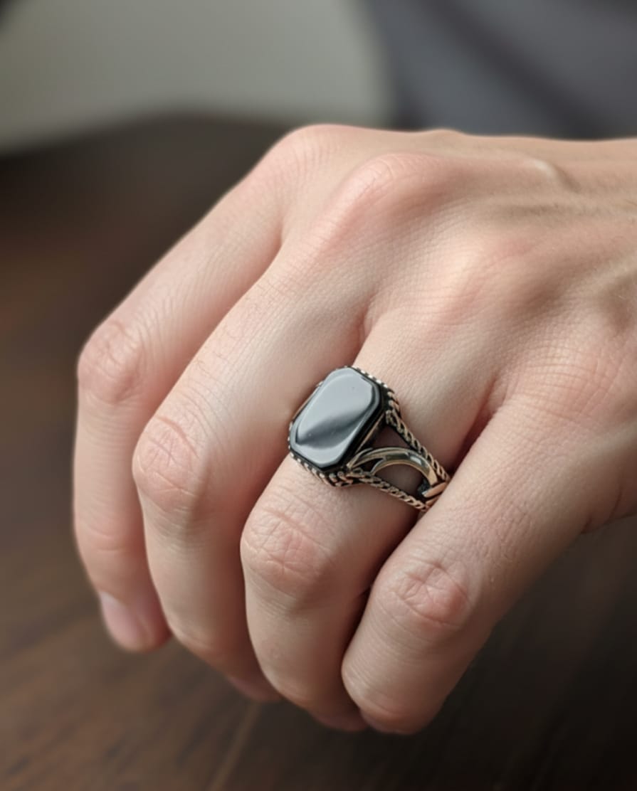 The design is heavy and masculine, featuring a classic, rugged setting. The band’s shoulders are detailed with intricate oxidized scrollwork and flanked by deep black accent stones, adding a bold, distinguished contrast. This ultimate accessory is perfect for the man who appreciates natural beauty, history, and a style that feels authentically his.